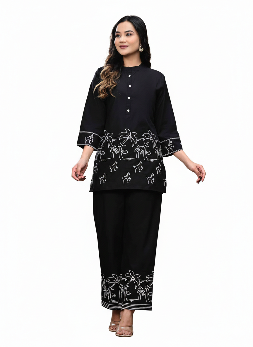 Elegant black co-ord set featuring a stylish round neck kurti with front buttons and 3/4th sleeves.