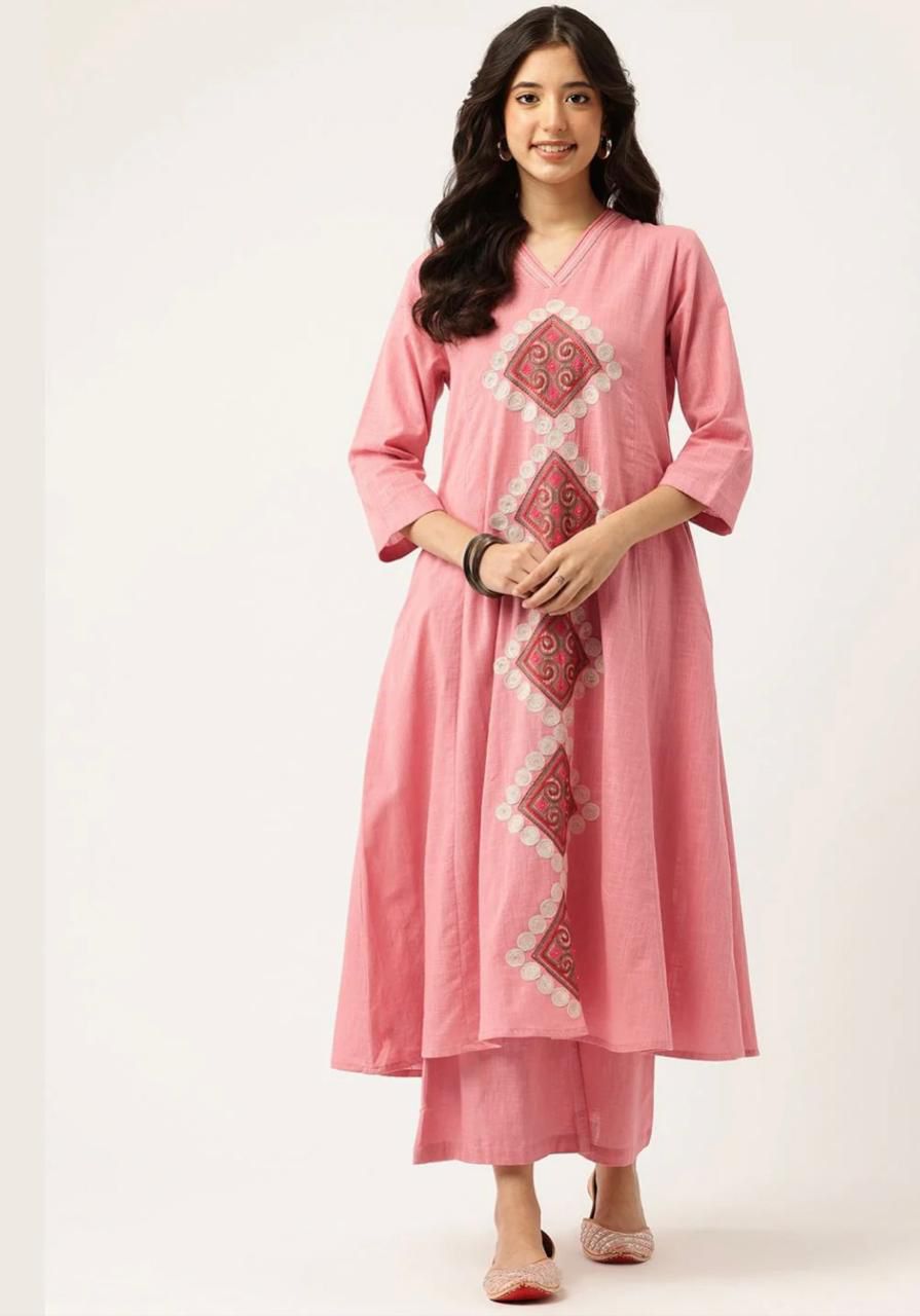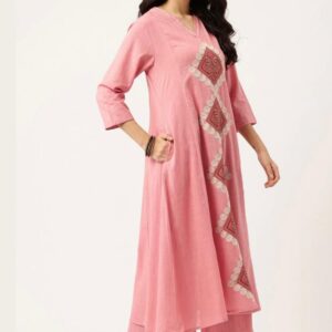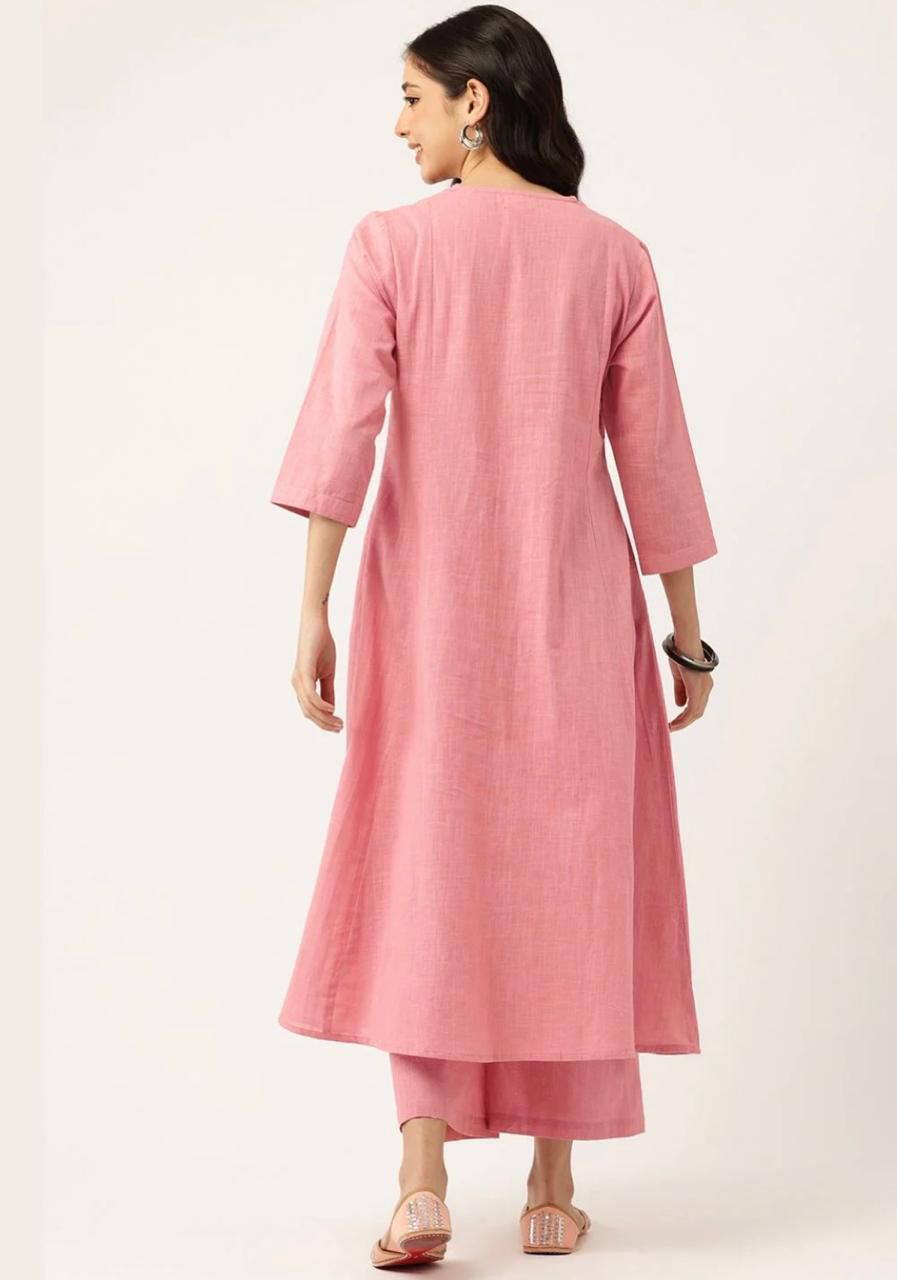 This Rose Pink Grace Embroidered Co-Ord Set perfectly blends traditional craftsmanship with modern comfort. The flared A-line tunic features elegant thread work on the front, creating a sophisticated look. Made from lightweight cotton, this 2-piece set is designed for an effortlessly graceful and comfortable style throughout the day