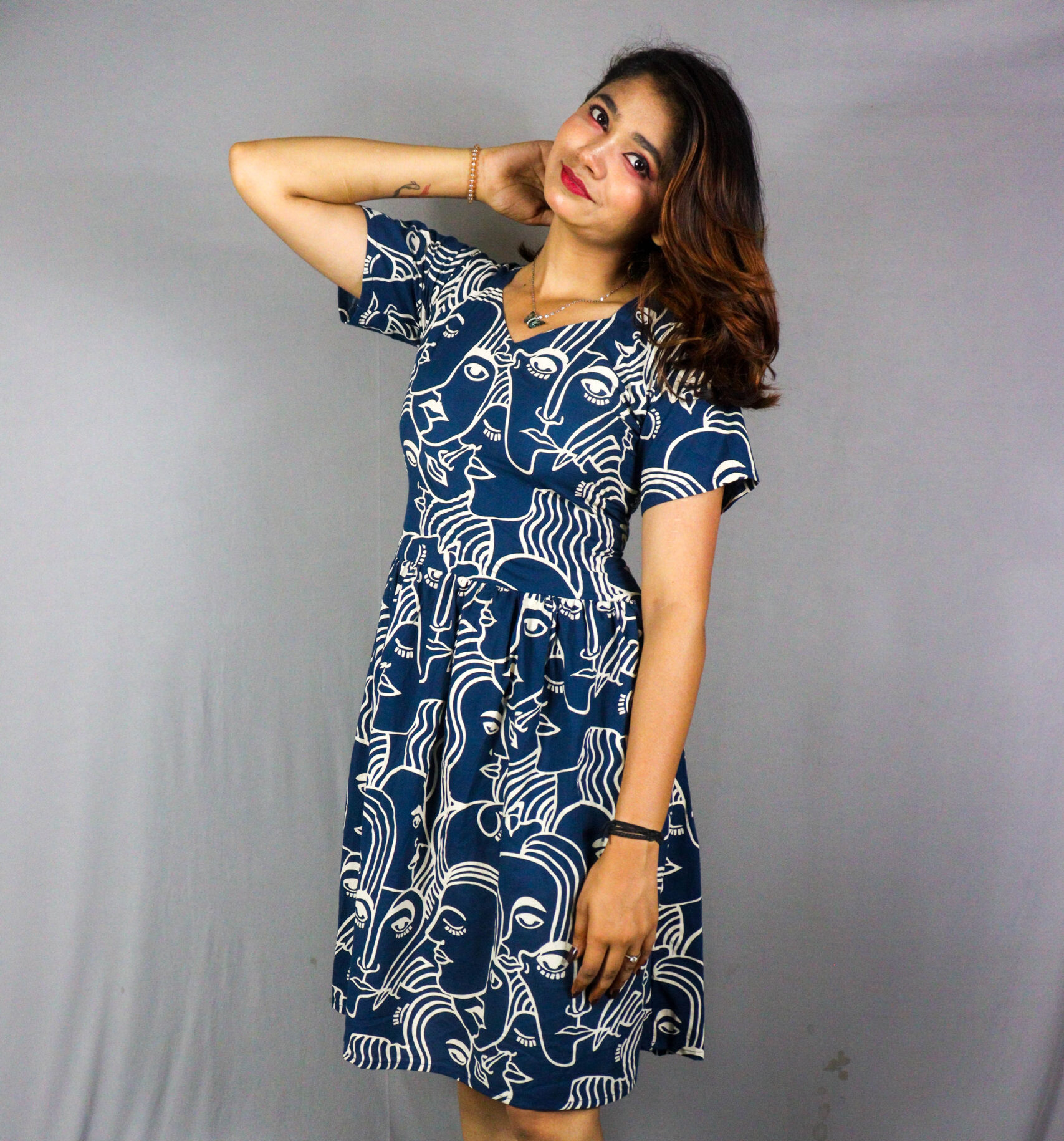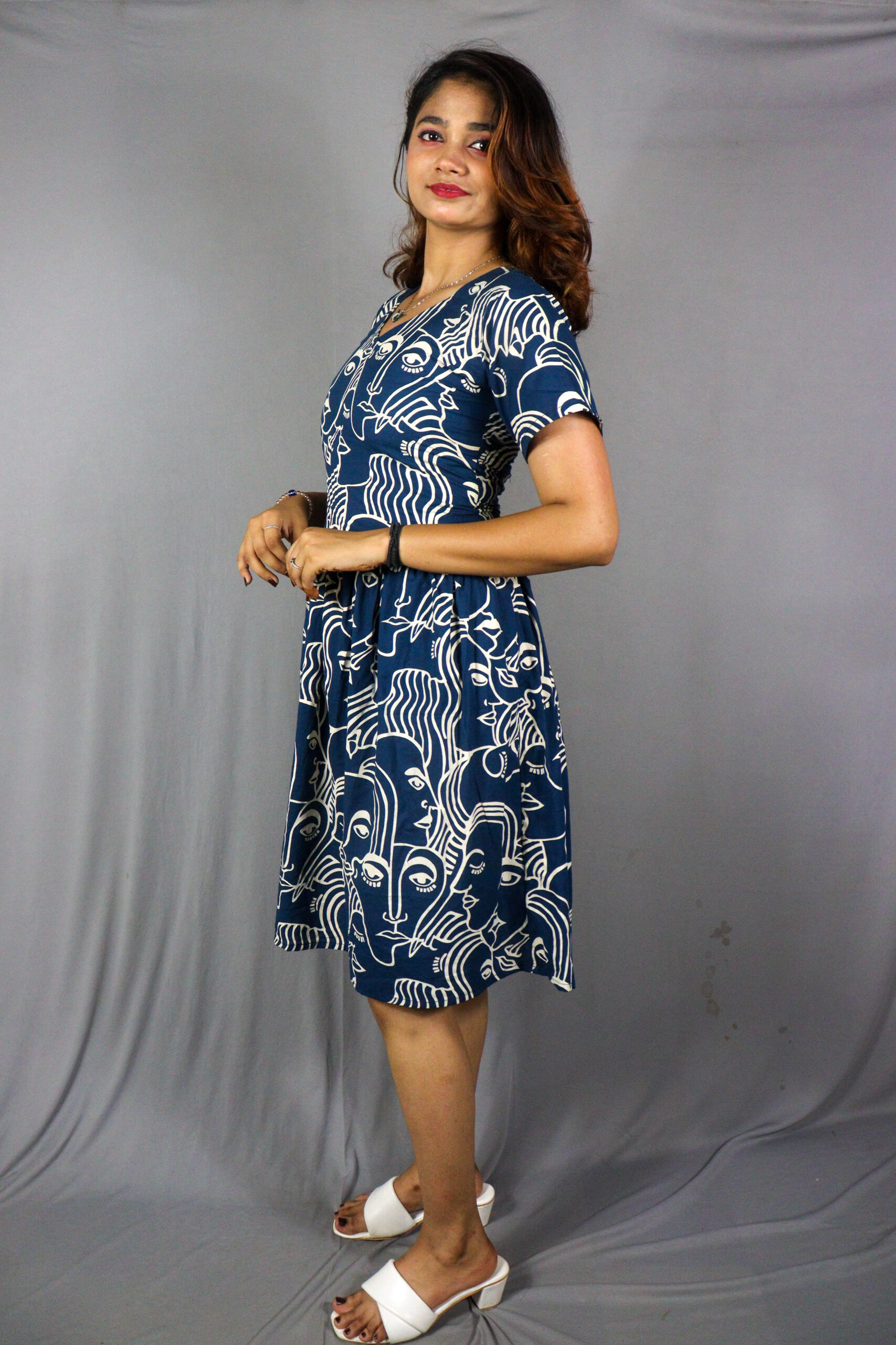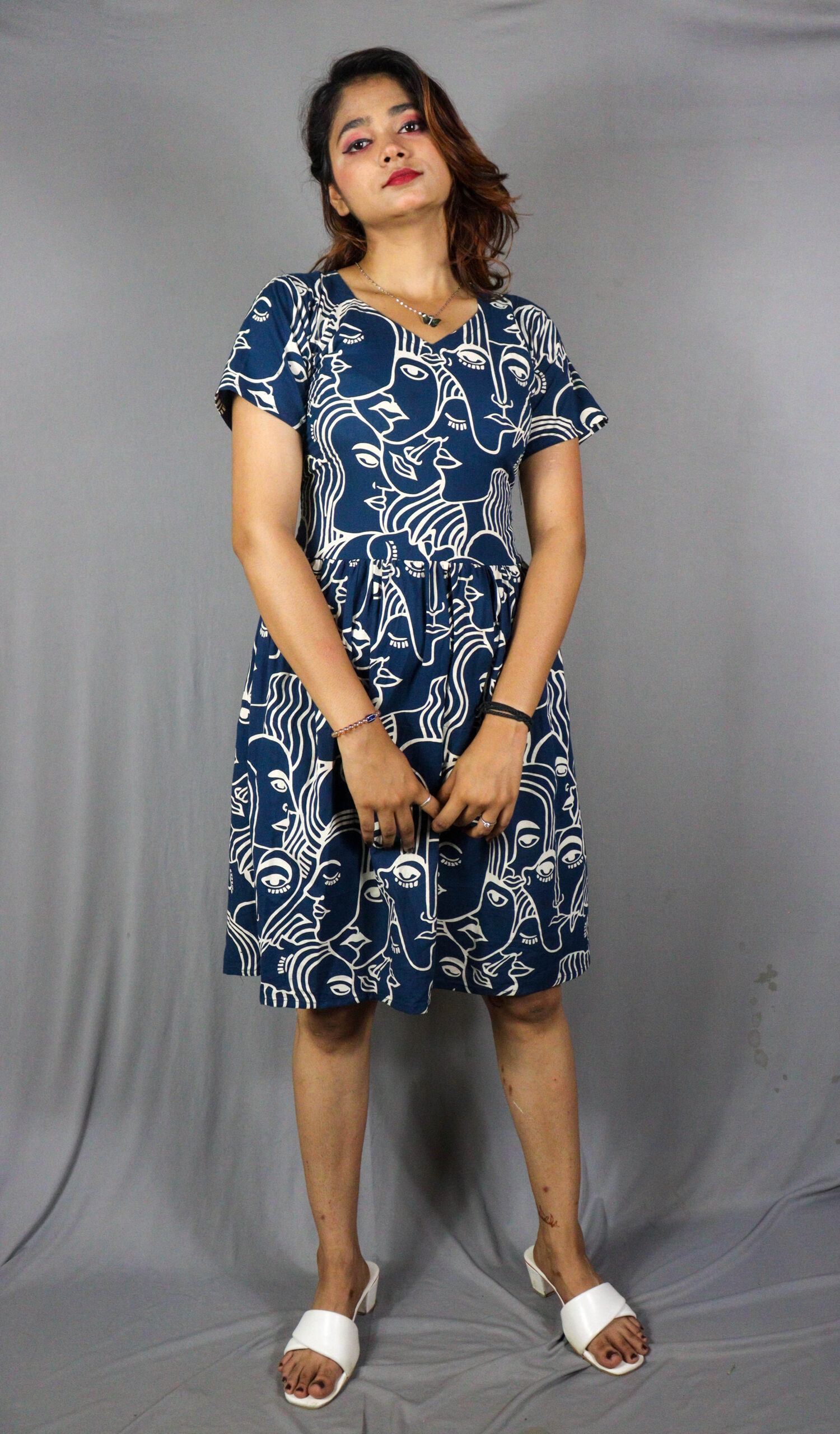 A chic navy cotton dress featuring bold, artistic face line-art prints for a modern, expressive look. Soft, breathable, and effortlessly stylish for everyday wear.