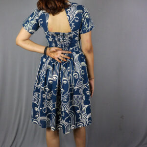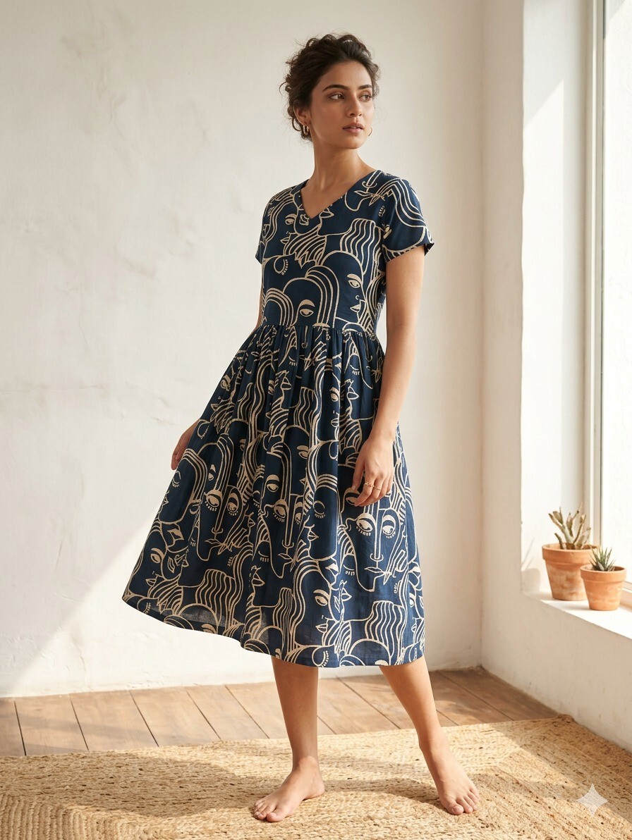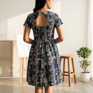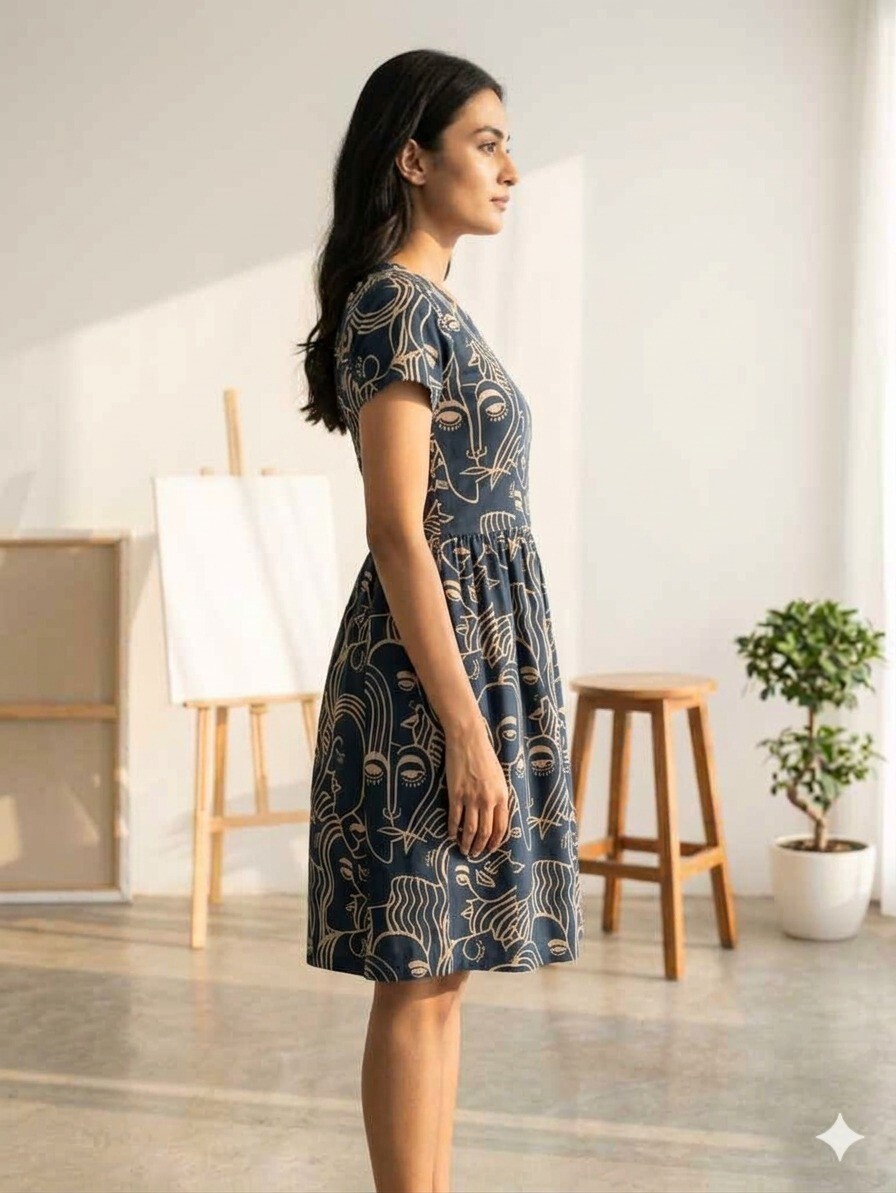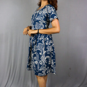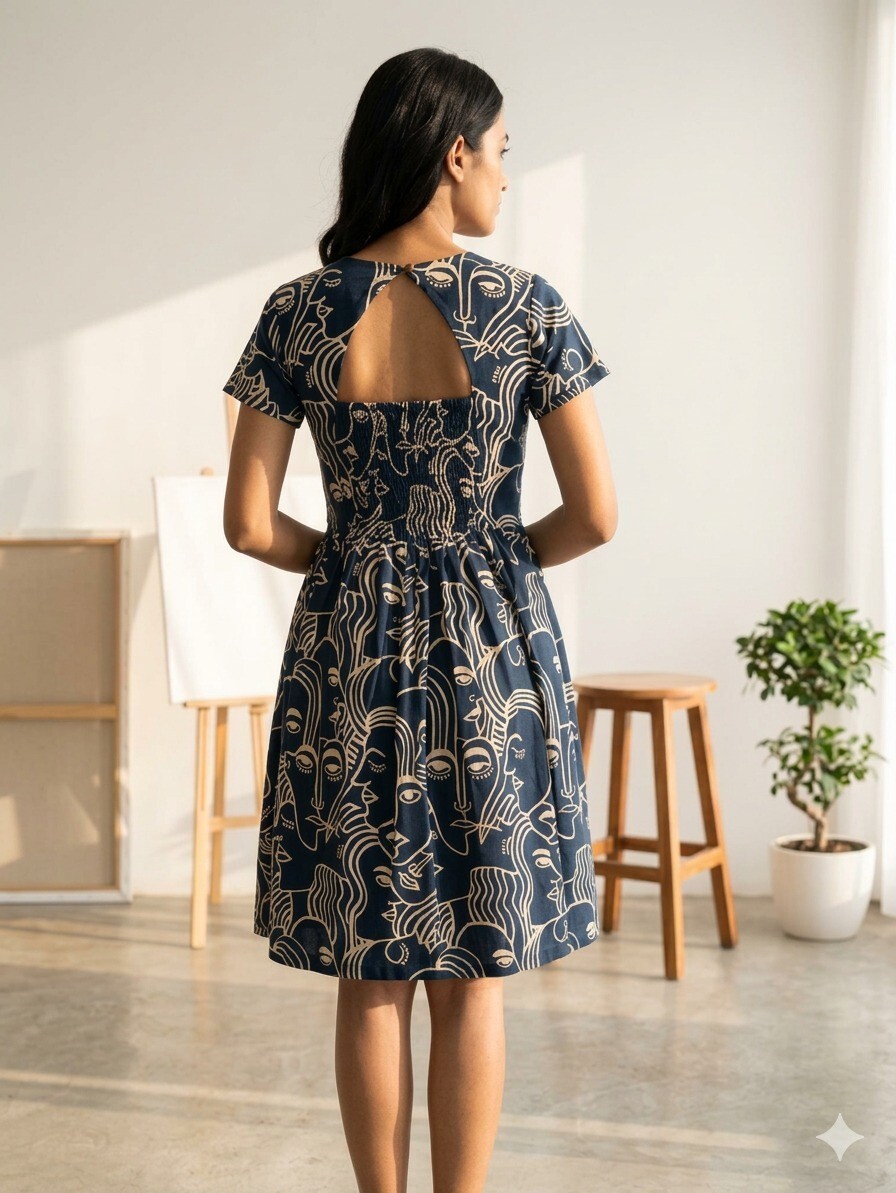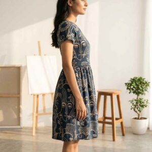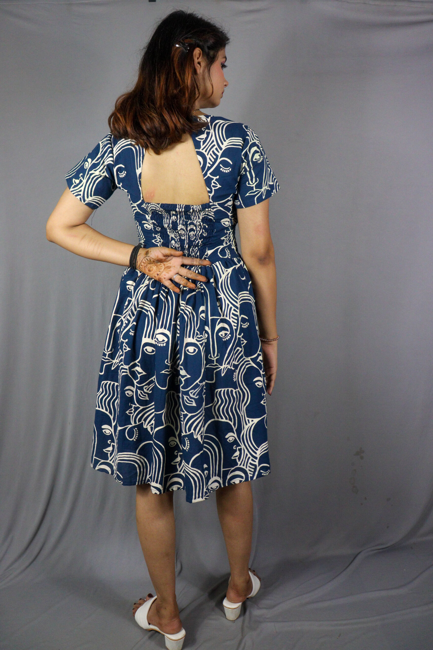 A chic navy cotton dress featuring bold, artistic face line-art prints for a modern, expressive look. Soft, breathable, and effortlessly stylish for everyday wear.
