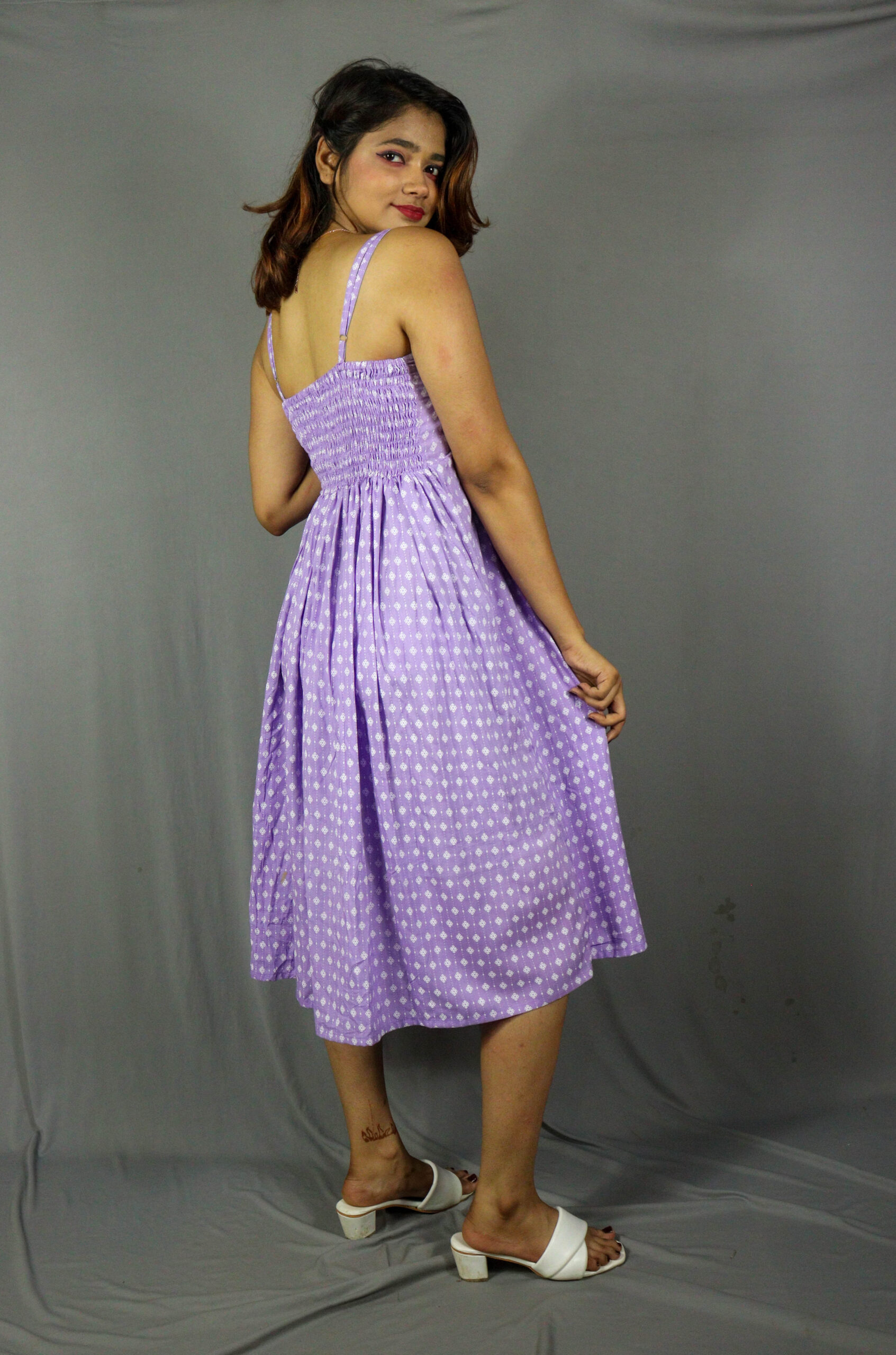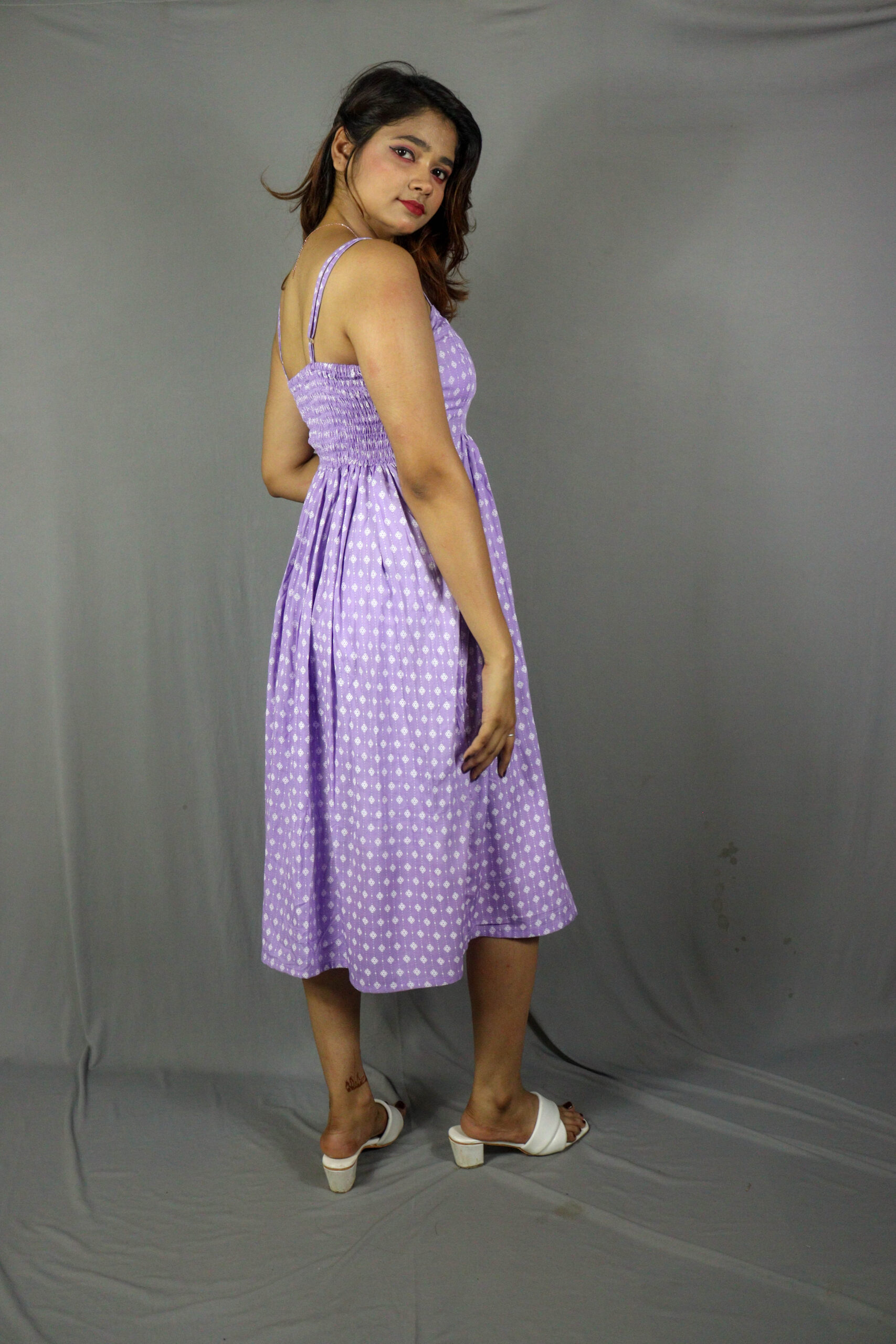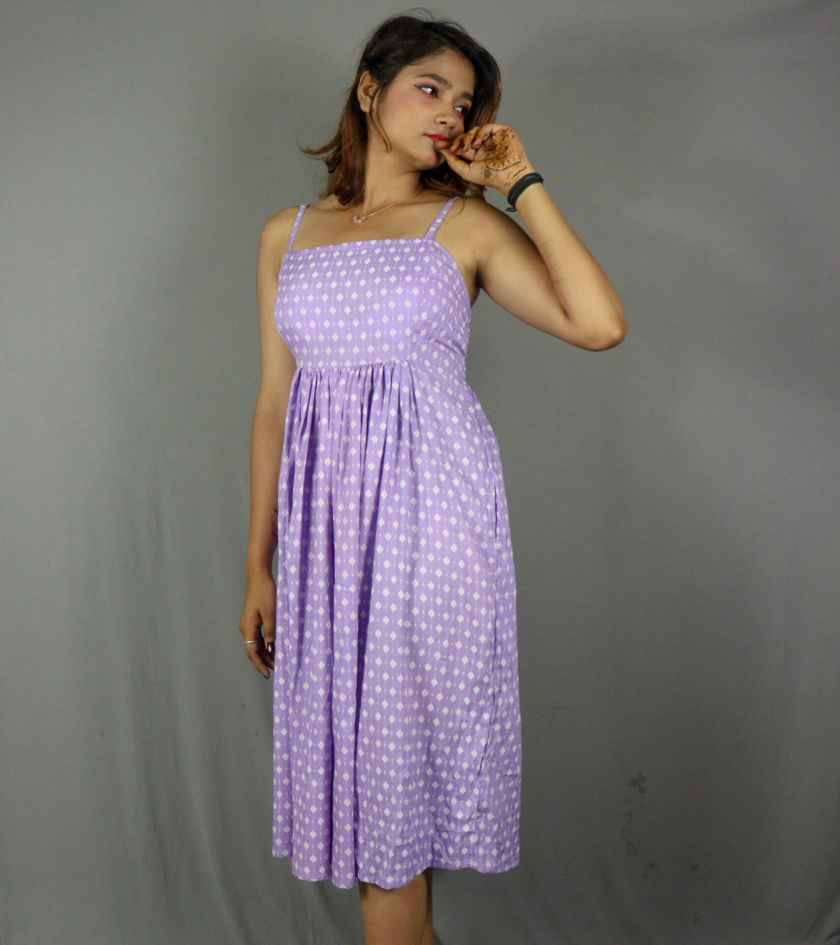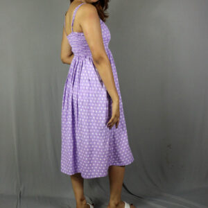 Lightweight lavender cotton midi dress featuring a soft polka block print and strappy neckline.