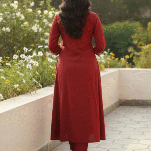 Sophisticated and timeless, this maroon kurta set features delicate embroidery along the neckline and sleeves, complemented by eye-catching ethnic circular motifs on the sides. The graceful A-line silhouette adds flow and elegance, while the straight-fit pants ensure comfort throughout the day.