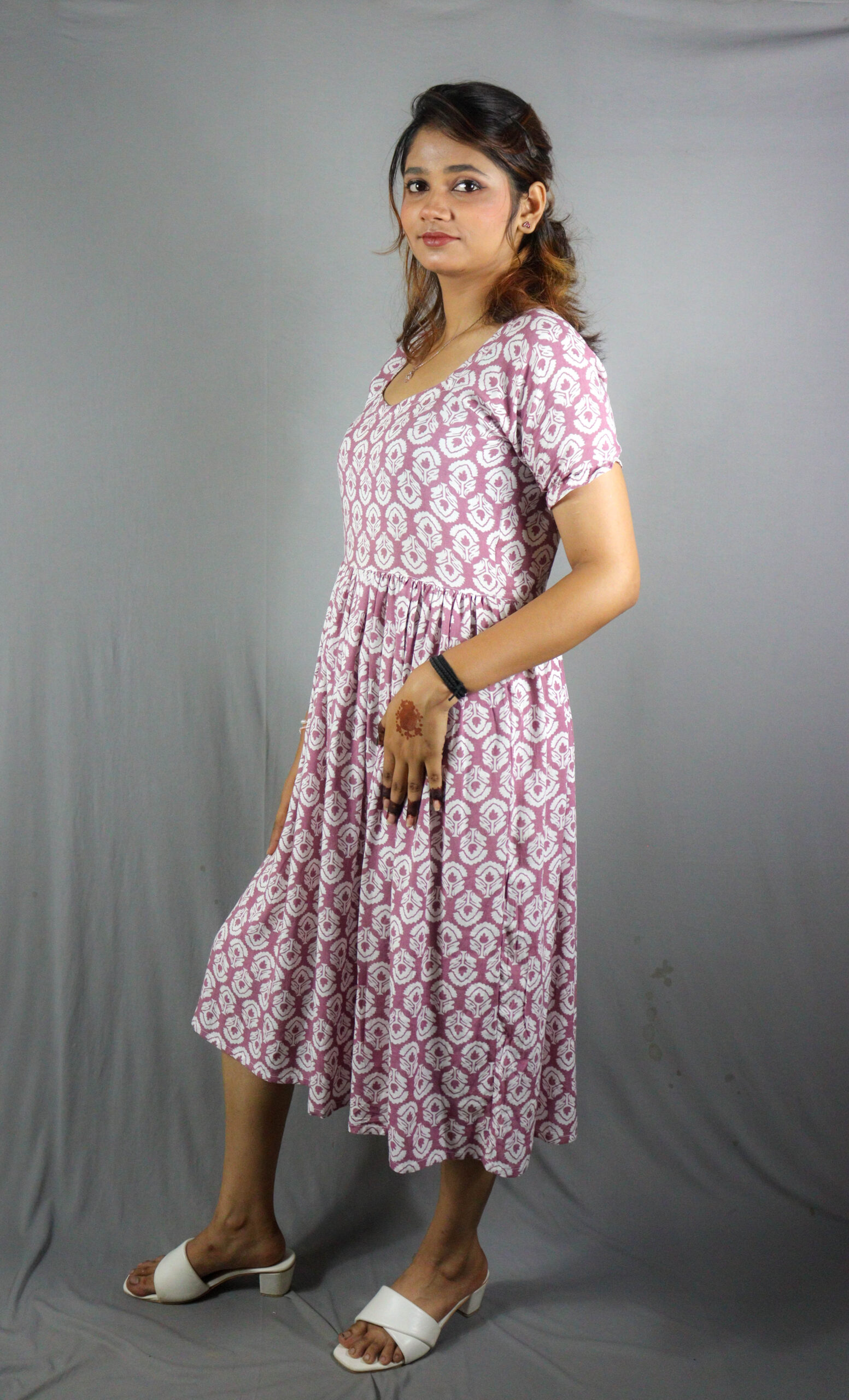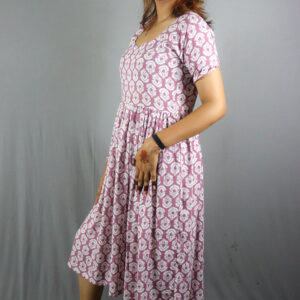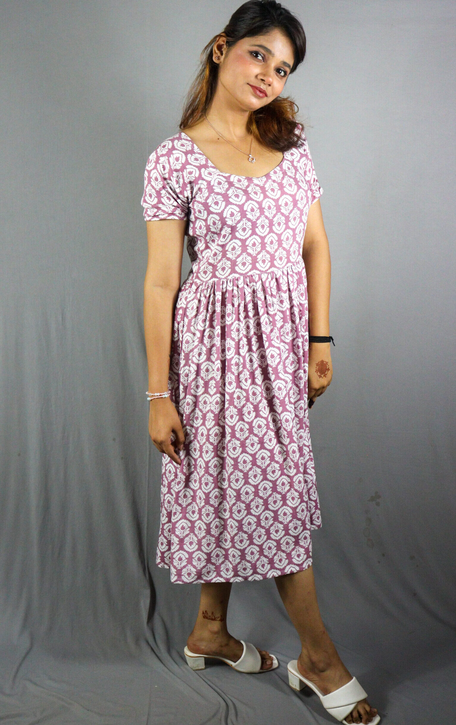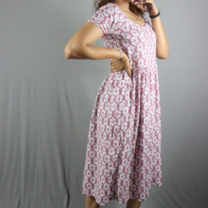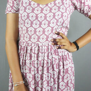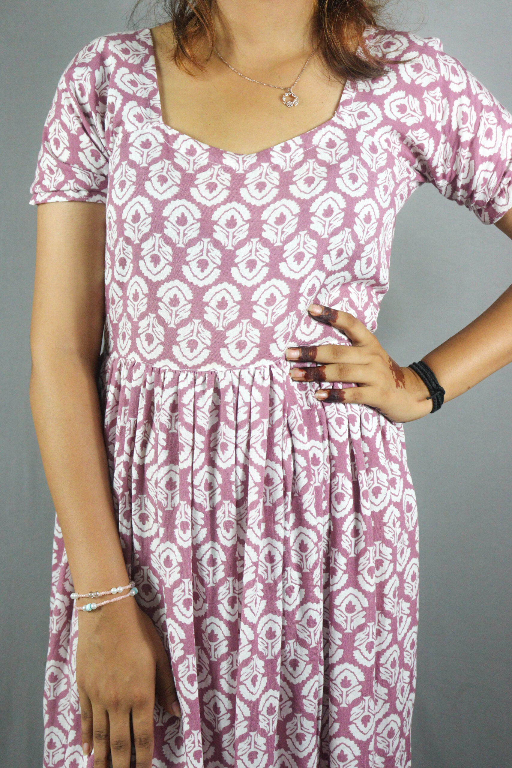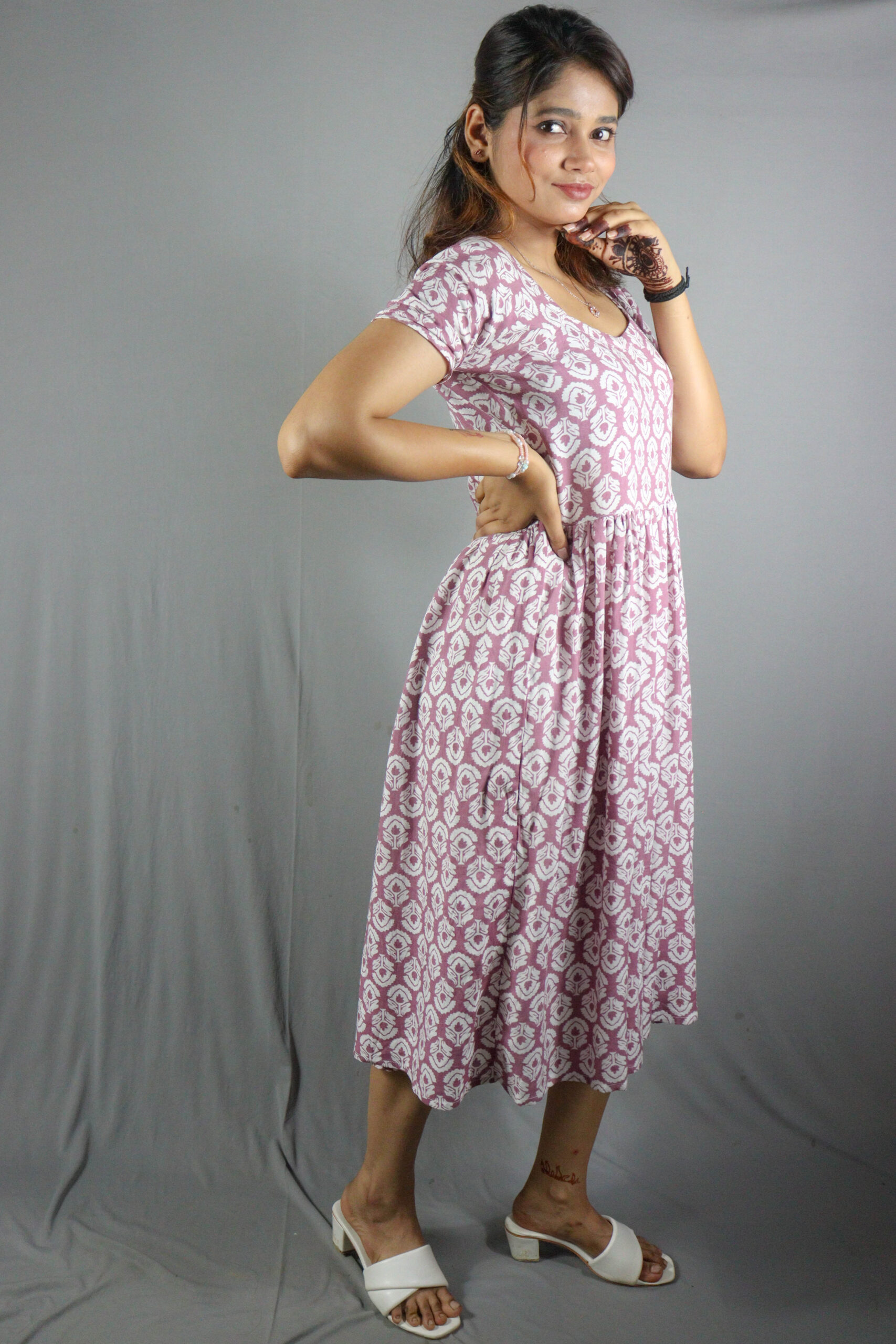 BP-Mauve Blossom Cotton Dress is soft, breathable cotton se bana hai, jismein elegant mauve block-print ek classic look deta hai. Iska relaxed flare design everyday comfort aur effortless styling ke liye perfect hai.