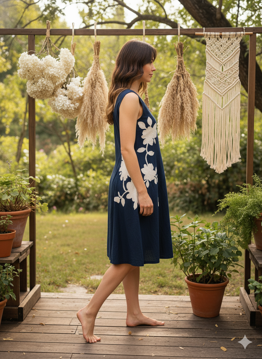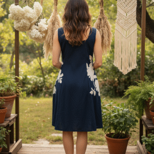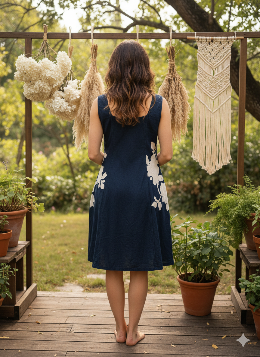 Simple, elegant, and effortlessly chic, this navy blue sleeveless midi dress features striking white floral prints that add a fresh and modern touch. Designed in a flattering A-line silhouette, it offers comfort and graceful movement throughout the day.