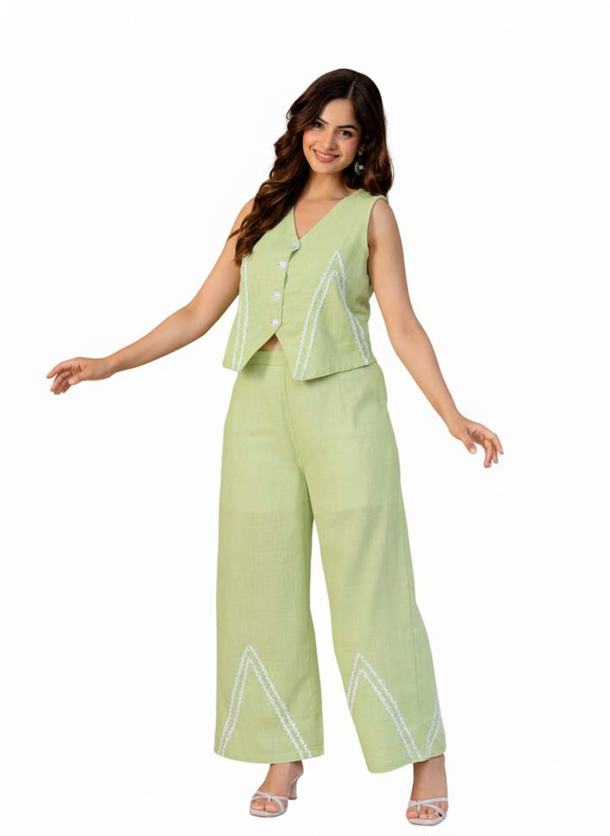 BP-Pista Green Sleeveless Embroidered Co-Ord Set for Women