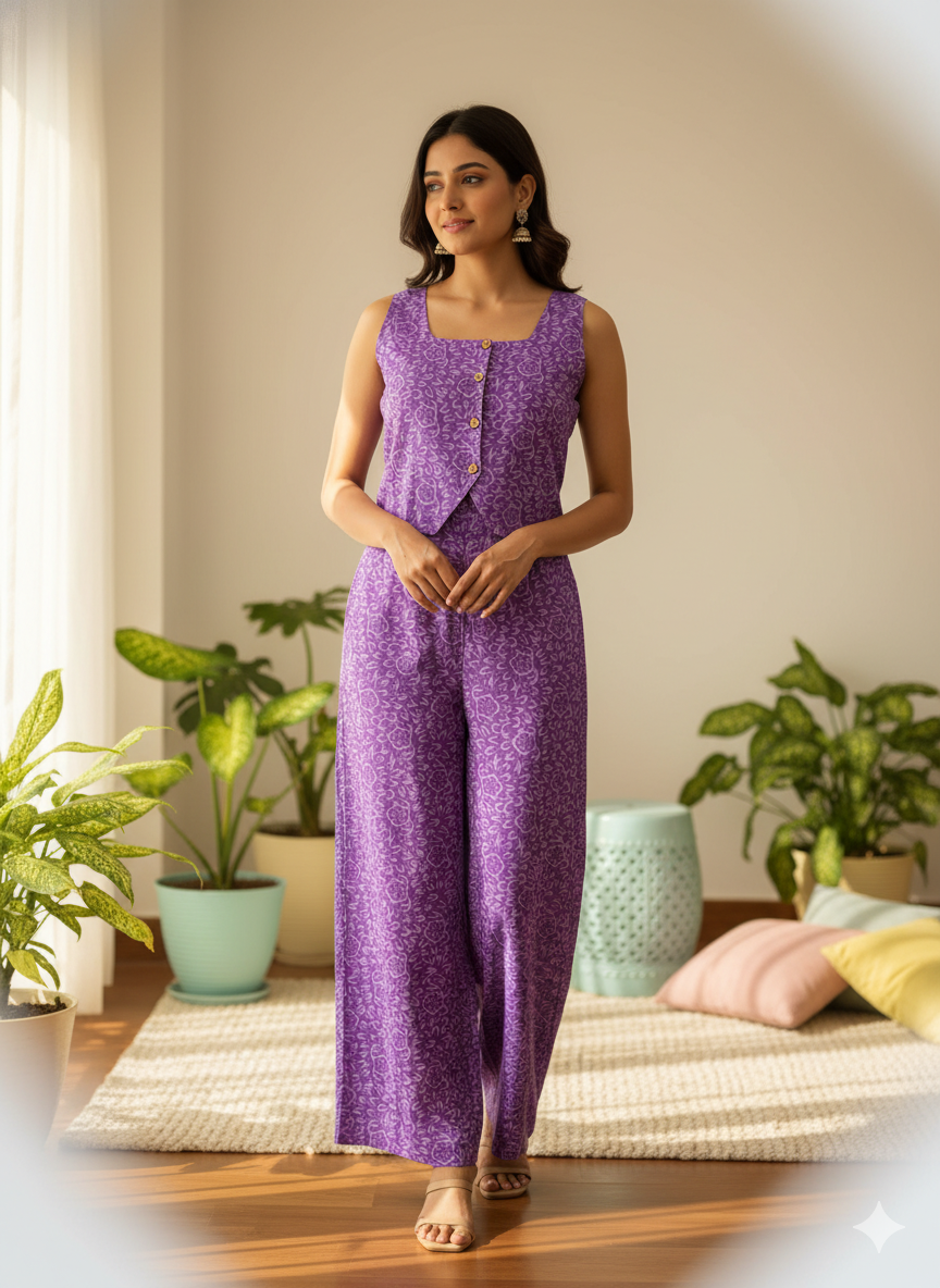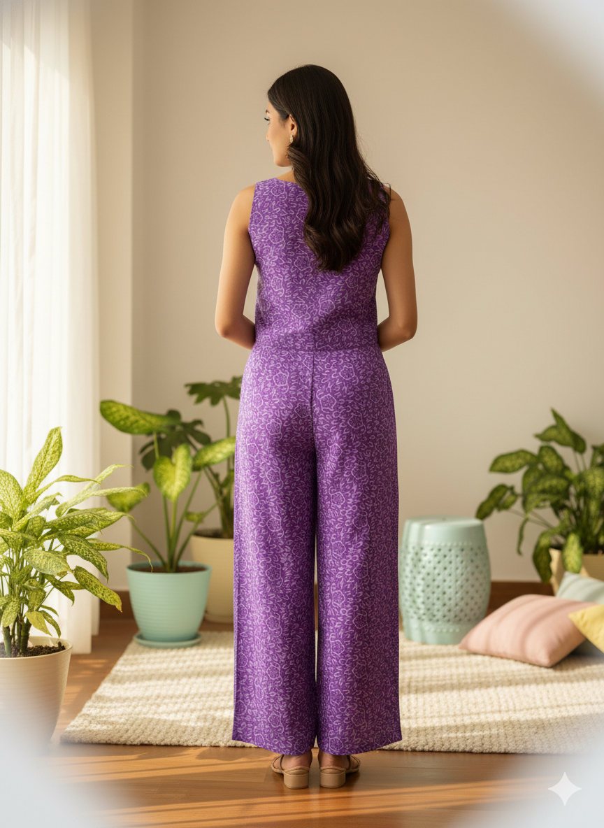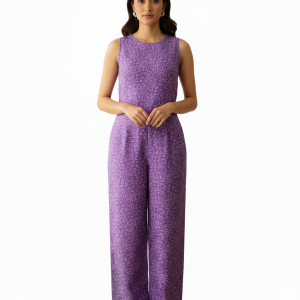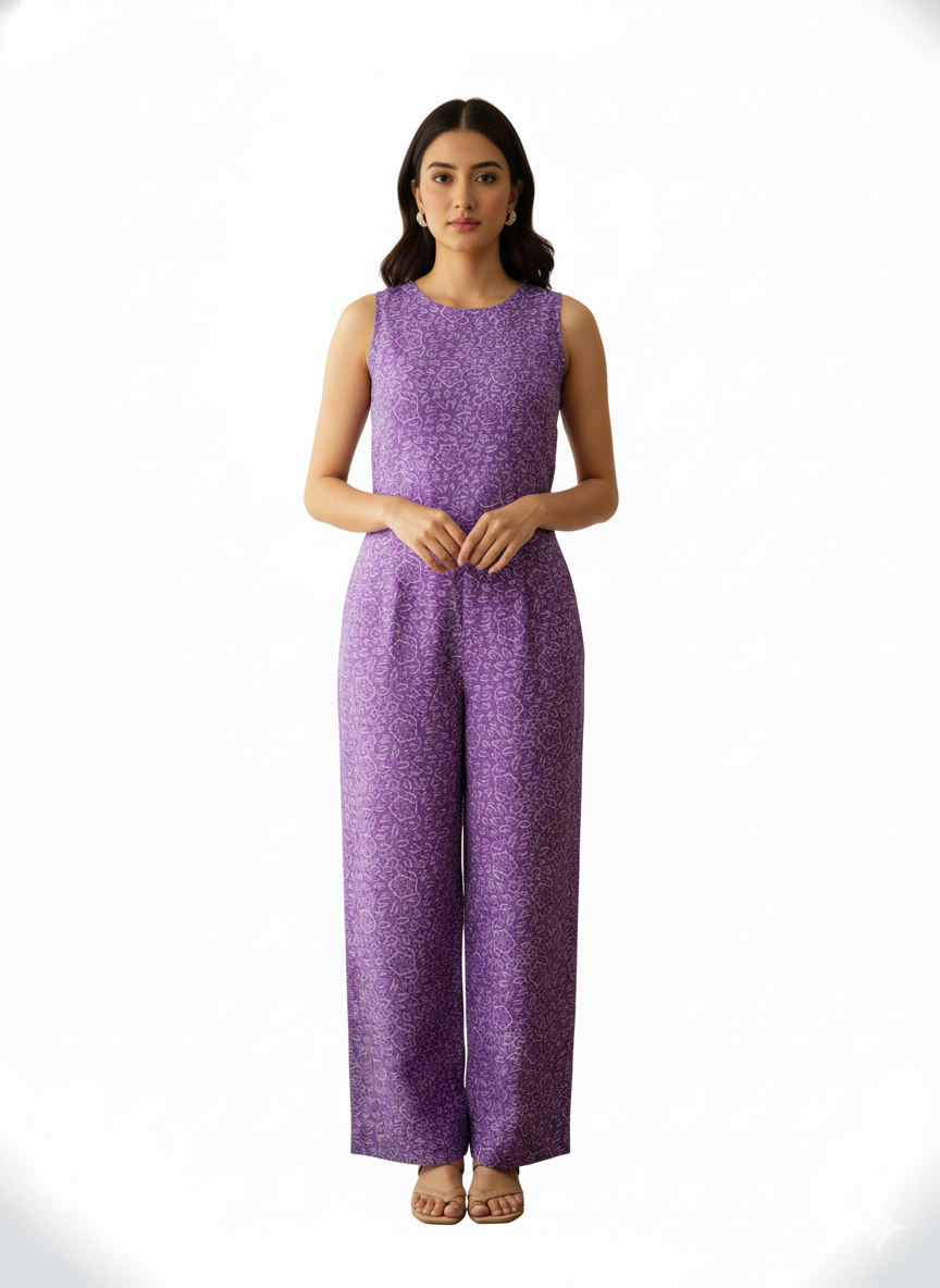 Elegant purple printed sleeveless jumpsuit with a soft, breathable feel.