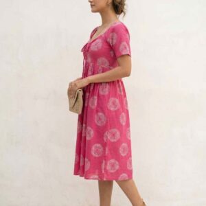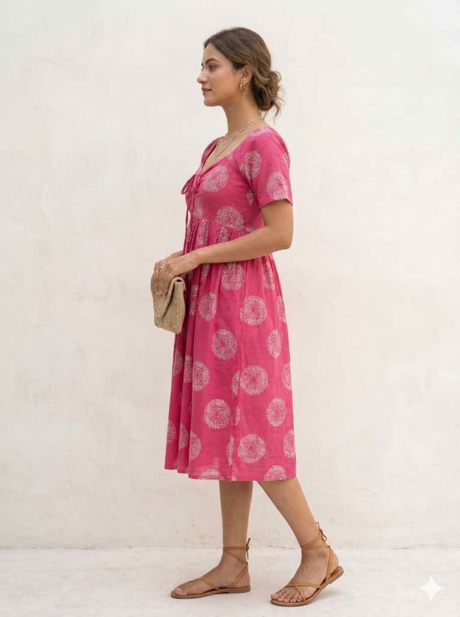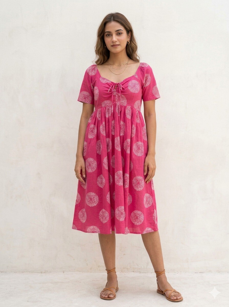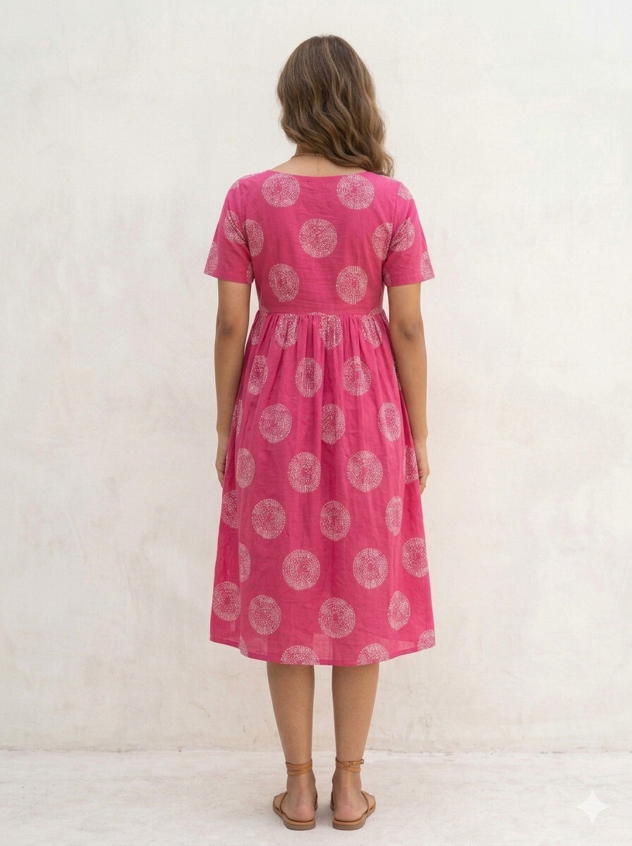 Circle block-printed flared cotton dress with a soft, flowy silhouette