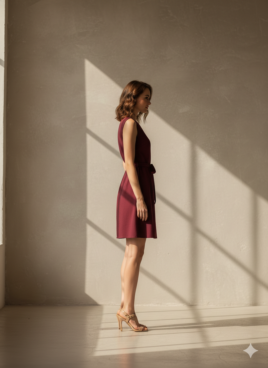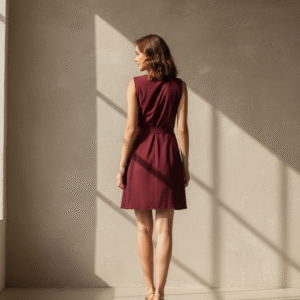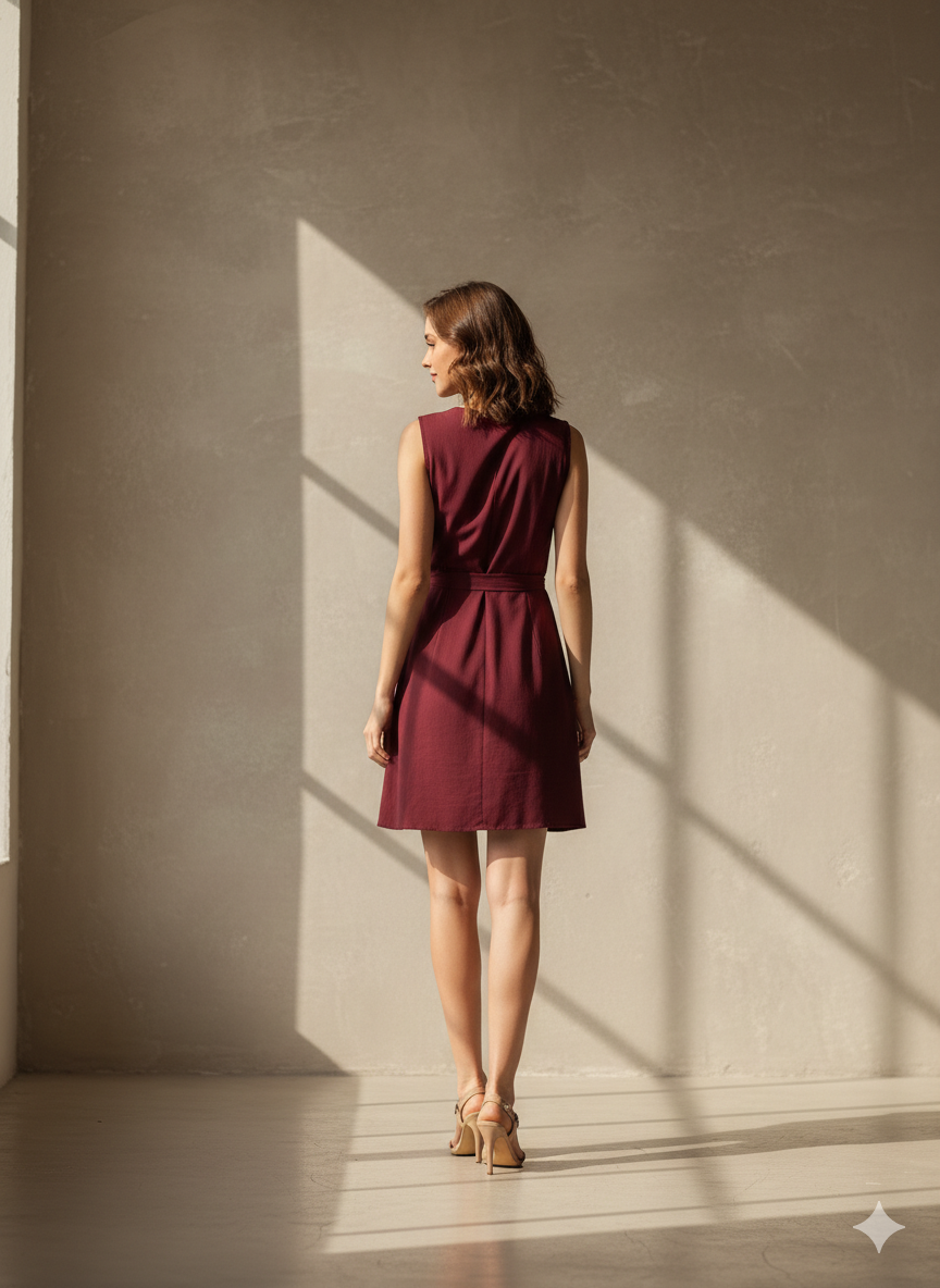 A chic and professional Maroon Sleeveless Wrap Dress that blends minimalist design with a flattering silhouette. The wrap-front and waist-tie highlight the figure, while the clean A-line cut makes it perfect for transitioning from work to evening events.