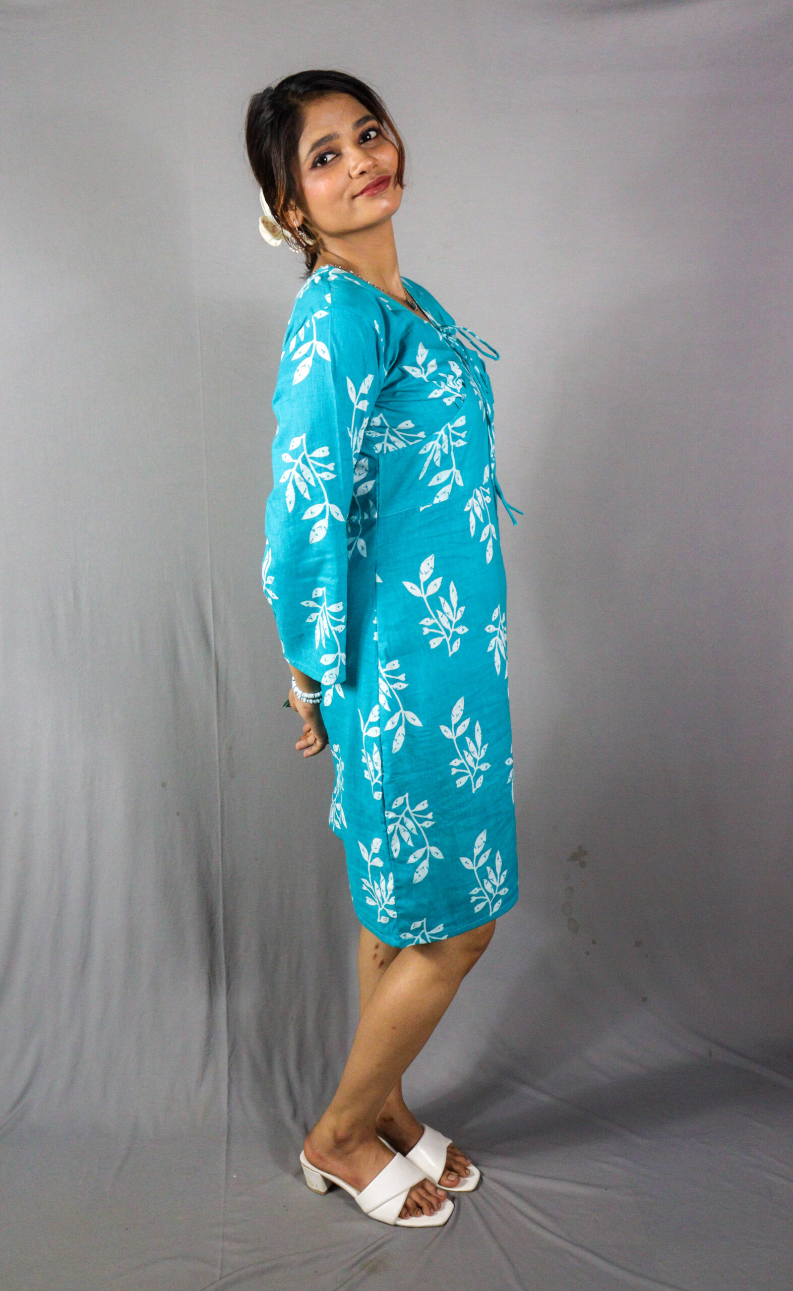 Soft turquoise cotton kurti dress with a refreshing white leaf print.