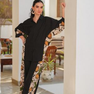 Stylish black co-ord set featuring a smart shirt-style top with button-down front.
