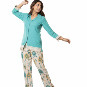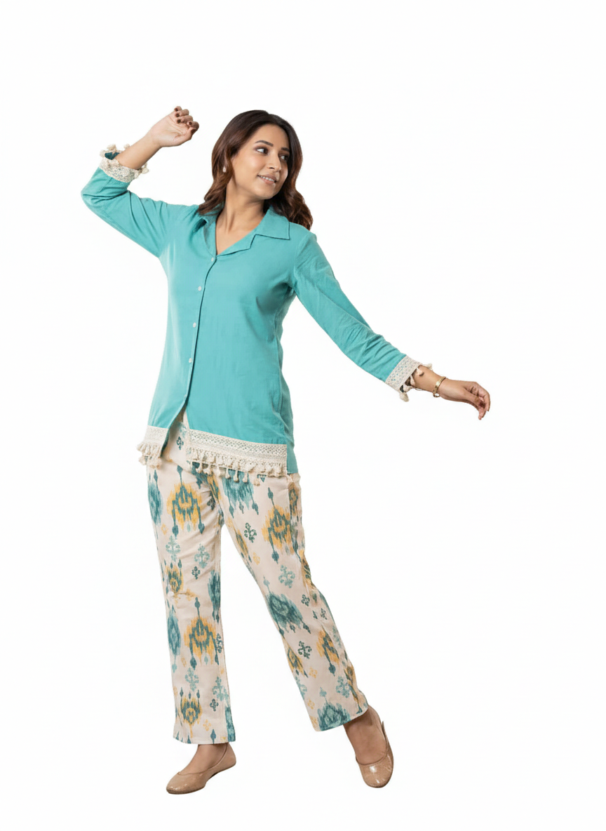 Stylish teal green shirt-style top paired with beautifully printed straight pants for a trendy ethnic look.